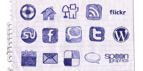 A set contains 14 free hand drawn doodle icons for bloggers. These includes social media graphics for Delicious, Design Float, Digg, Facebook, StumbleUpon, Technorati and Twitter as well as commonly used icons such as RSS, Home, Comments, Contact and WordPress.