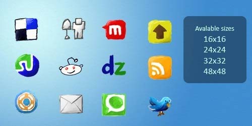 A hand drawn social media icon set that contains 12 icons. Package contains icons for del.icio.us, Digg, Mixx, DesignBump, StumbleUpon, Reddit, Developer Zone, DesignFloat, Technorati, Twitter and RSS feed & Email icon