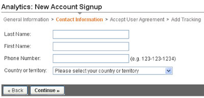 2.Next step google will ask you for website (your blog URL), account name (wahtever you want), and time zone. Then click "Continue"